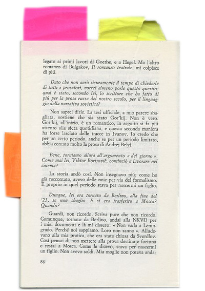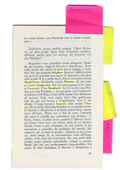 Viktor Sklovskij: Bulgakov è uno splendido artista diseguale. Quando, per esempio, leggo Il Maestro e Margherita… Sono come vestiti che vanno in pezzi per la pioggia e l’umidità. Nel suo romanzo Bulgakov descrive l’edificio dove noi scrittori avevamo una specie di ristorante, che dava sulla strada. E’ lì, a pochi metri, dietro una parete viveva Mandel’stam, dirimpetto viveva Platonov. In una stanza viveva Majakovskij. Per un certo periodo ci ha vissuto Pasternak. C’era Sostakovic. Era la vecchia casa Herzen, sul viale Tverskoj – da una parte c’era l’ambasciata danese e dall’altra c’erano dele stanze dove abitavano gli scrittori. Cioè cosa voglio dire: Che quell’epoca non era così brutta e insignificante. Non lo era affatto. C’erano ancora i futuristi, c’era l’Opojaz. Ma va anche detto che Bulgakov è un grande artista. Il Maestro e Margherita è un’opera forte, soprattutto all’inizio: Pilato con il mal di testa, l’apostolo che cerca un coltello per ammazare una persona… Il finale, invece, mi piace meno, quando il Maestro incontra Cristo viene fuori che hanno nulla di cui parlare. Perchè Cristo più informato ha più notizie, è più interessato e coinvolto dai problemi del mondo. Nel romanzo, poi, ci sono le streghe… Quando io ero giovane, tanto tempo fa, ci interessavamo tutti dell’argomento, c’era tanta letteratura. No, non parlo delle favole, erano ricerche scientifiche, volumi e volumi. Bosch, per noi, era perfettamente comprensibile. Dal punto di vista ideologico Il maestro e Margherita è legato ai primi lavori di Goethe e a Heghel. Ma l’altro romanzo di Bulgakov, Il romanzo teatrale, mi colpisce di più.