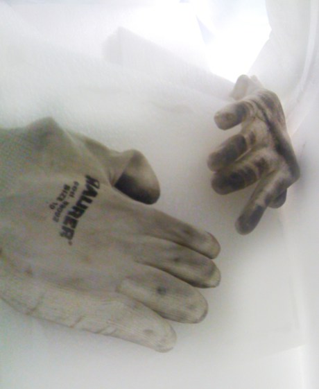 Le immagini delle cose nella nostra “testa” si sovrappongono e questo produce stati del pensiero, emozioni. Al termine del trasporto dell’opera di Pellizza lo sguardo  mi cade sui guanti dei trasportatori, degli operai che sanno come si sollevano opere che pesano 4 volte il peso del loro corpo. Pare che per loro le leggi della fisica non esistano da quanto sono interiorizzate in ogni loro muscolo, da come il corpo si sposta con una intelligenza fisica  nel corso della “movimentazione”.
