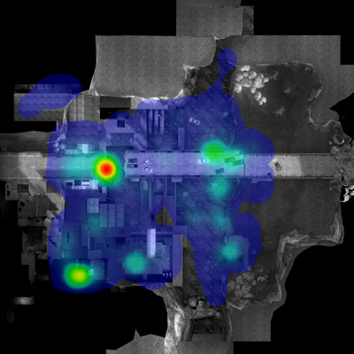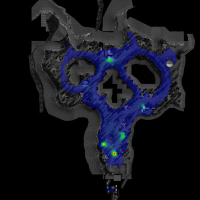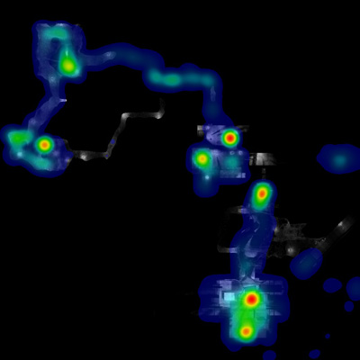 Nei mesi scorsi, ricordo, rimasi incuriosito da alcune mappe che giravano sul web. Le ho recuperate e ora le pubblico qui. Mostrano le zone dove i giocatori perdono più frequentemente la loro avatar-vita. Le Death Maps sono il risultato di statistiche sviluppate osservando milioni di giocatori che giocano in rete. Il gioco in questione è half life 2, prodotto dalla Valve e il servizio on line è offerto dalla Steam. Queste mappe mi sono tornate in mente pensando a quanto ho scritto nell’ultimo post e al discorso dei segnali di pericolo che l’ambiente ci comunica e di come l’ambiente stesso sia stato plasmato, “rivestito”, per poterlo sempre riconoscere. Maurizio, un amico con il quale scambio sempre temi, letture e pensieri, mi ha consigliato un libro che non ho ancora letto ma già solo il fatto di conoscerlo mi ha suggerito alcuni pensieri. L’odore tra tutti è un segnale molto forte, diretto. L’odorato è il senso che, se stimolato, comporta una reazione istantanea del nostro corpo. Pensavo agli avatar che non possiedono l’odorato. Non c’e’ nessuno strumento nei mondi virtuali che abbia ancora virtualizzato questo senso. Questo si porterebbe dietro una altra dimensione che non è la memoria in bit ma il ricordo se è vero che l’odorato è il senso del riordo per eccellenza. Attualmente tutta la sicurezza dell’avatar si basa sull’intuizione del gamer che ha come strumenti di sopravvivenza la componente visiva, l’esperienza di gioco e la conoscenza delle regole (acquisita anch’essa durante il gioco). Se i mondi virtuali possedessero un plug-in “senso dell’odorato” i giochi sarebbero certamente molto diversi. Come cambierebbero le mappe?