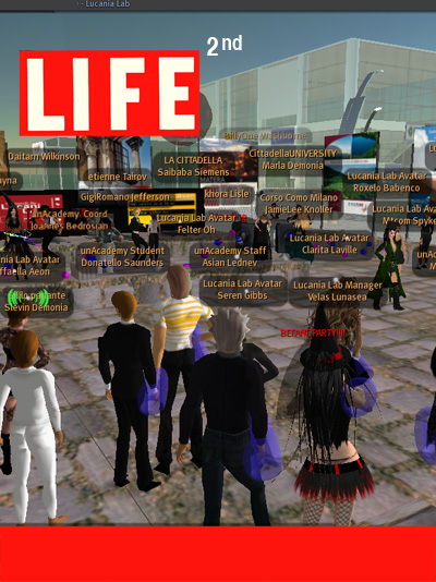 Questo che parrebbe sembrare un semplice gioco di montaggio (giocare con la testata di una nota rivista americana che raccontava la vita con lo strumento della fotografia) nella sostanza svela la dimensione immersiva di questa piattaforma. Con Liu, Joannes e con Rosa abbiamo più volte fatto dei veri viaggi in second life. La stessa intervista al lucania lab mi ha permesso di ragionare su questo aspetto.
